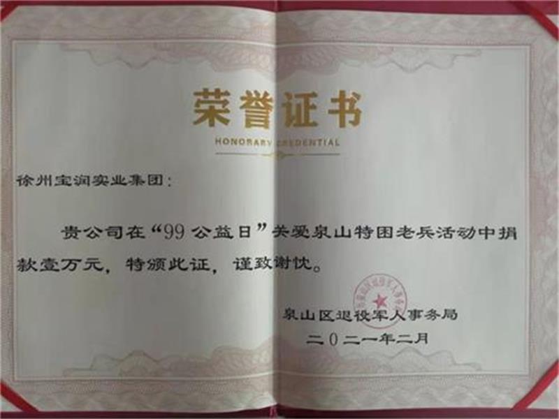 徐州寶潤實業(yè)集團積極圍繞市委、市政府中心工作,踐行社會主義核心價值觀,營造“人人參與、人人慈善”的良好生態(tài)環(huán)境,響應(yīng)2020徐州市“99公益日”主題為“攜手慈善愛滿彭城”的活動號召,于“99公益日”當(dāng)天的“關(guān)愛泉山特困老兵”活動中捐款一萬元整。