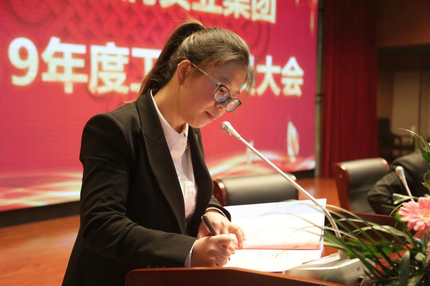 在莊重和諧的氛圍中,集團董事長張愛平同志與集團各公司簽訂2019年工作責任狀。