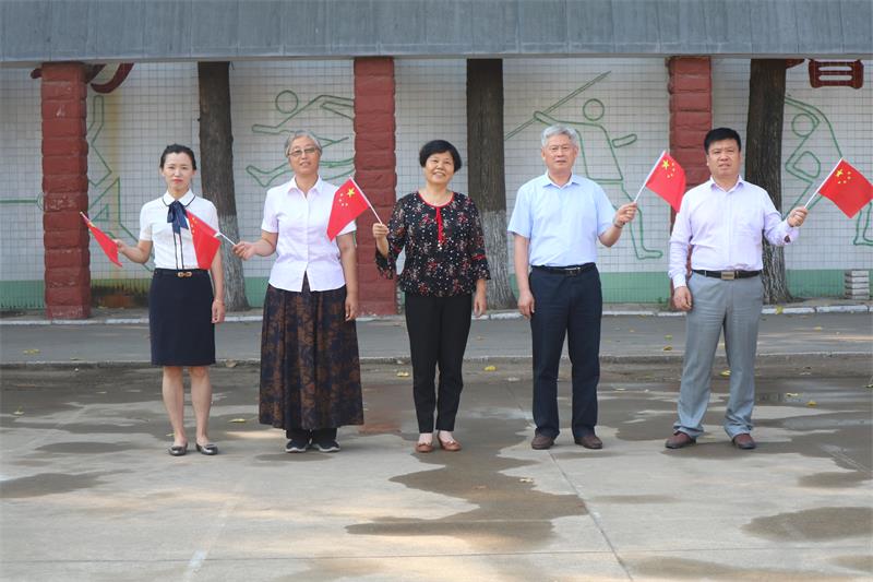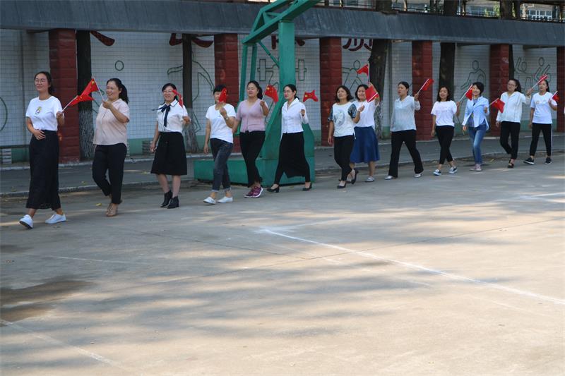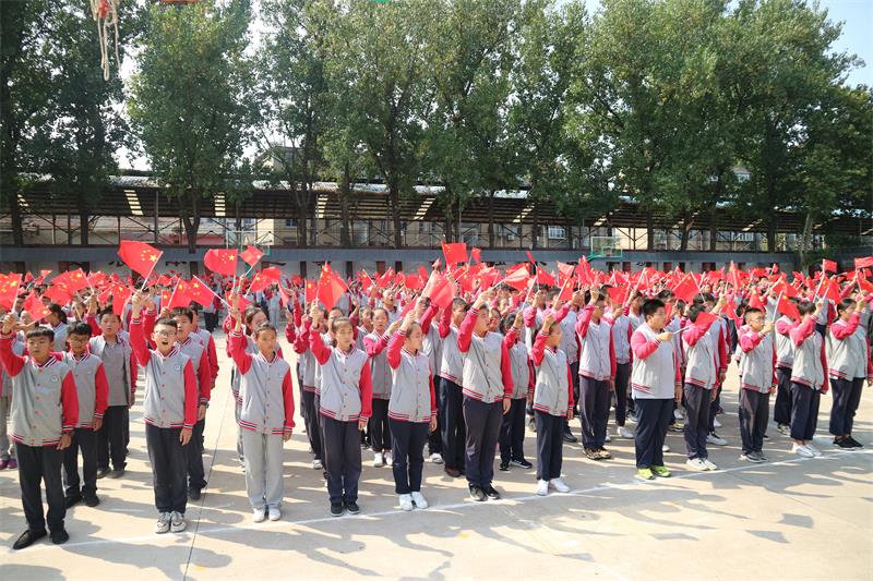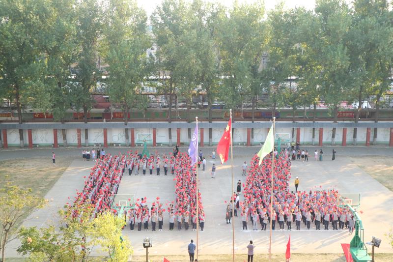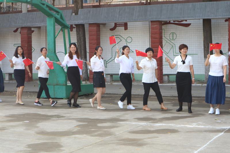 全校師生伴隨音樂節(jié)奏揮動(dòng)手中的小國(guó)旗,操場(chǎng)變成了紅色的海洋。
