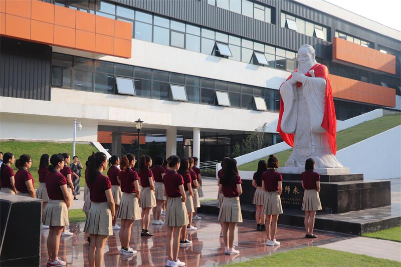 祭孔儀式在悠揚肅穆的古樂聲中開始。身著禮儀漢服的學生及眾祭者肅立于孔像前。首 先是教師代表向孔子像誦讀誓詞鞠躬行禮。孔子思想是中國傳統(tǒng)文化的主干,承繼孔子的教育思想(師齊)—-因材施教、教學相長、有教無類、溫故知新、學思并用,以萬代師表孔子為楷模,教書育人,做現(xiàn)代教育的踐行者、開拓者。讓我們懷著崇高的敬意,對我們的先師——孔子,致禮!
