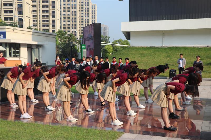學生整齊站列身著漢服吟誦誓詞,向孔子像作揖行禮,誦讀誓詞。勵志成為謙虛謹慎、嚴格自省、品格高尚的樹恩人。而后,學生表演了《君子九思》《孔子爺爺》等節(jié)目。