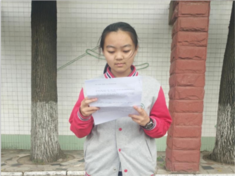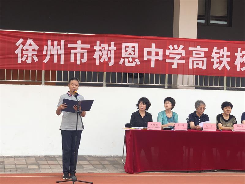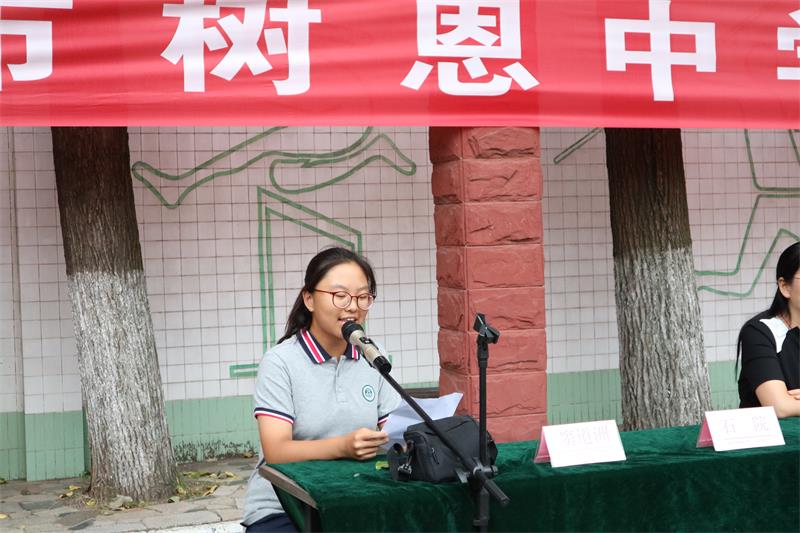 七5班李語(yǔ)凡同學(xué)發(fā)言:我們將用求知、拼搏的快樂(lè)來(lái)豐富我們生活的色彩,我們將用飛揚(yáng)的青春、跳動(dòng)的熱情來(lái)續(xù)寫(xiě)樹(shù)恩初中的光輝歷史