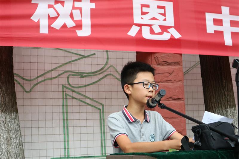 八1班唐皓文同學(xué)發(fā)言:讓我們追求卓越,創(chuàng)造出屬于自己的崢嶸歲月,樹(shù)恩中學(xué)會(huì)因你的奮斗而更加精彩