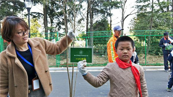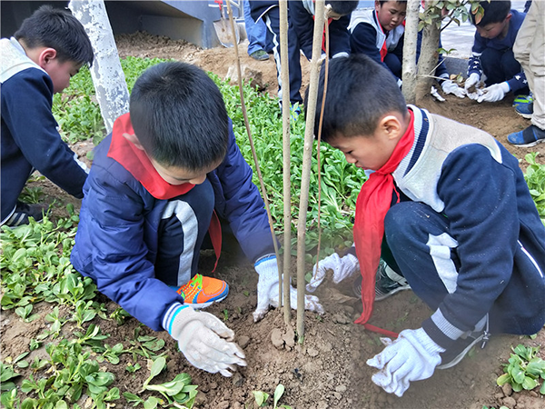 同學(xué)們身穿運(yùn)動服校服,佩戴著紅領(lǐng)巾,挖坑、植苗、填土、掛牌……那一個(gè)個(gè)忙碌的身影儼然成為一道風(fēng)景線。